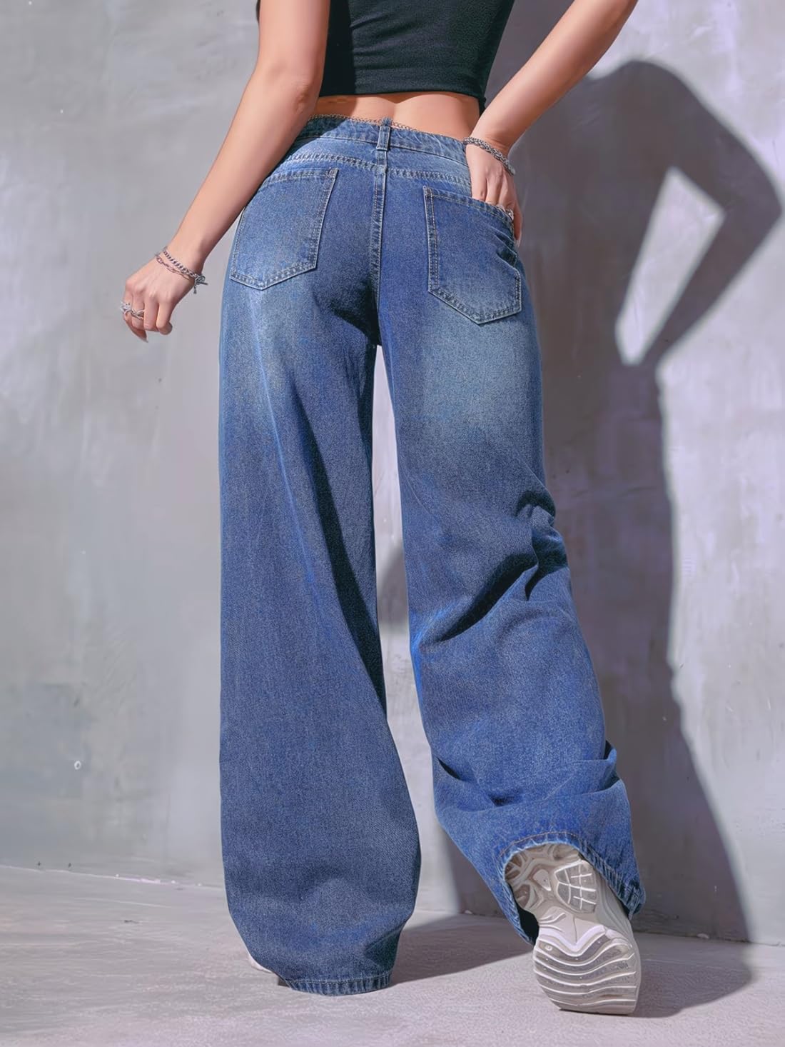 Featuring a loose cut around the legs, these jeans beautifully balance a trendy oversized look with a flattering fit. The classic denim texture coupled with subtle stitching details brings a timeless appeal to the pants, making them easy to pair with anything—from crop tops and casual tees to blazers and boots.