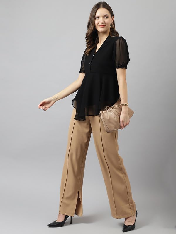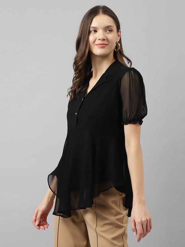 Made from high-quality Georgette fabric, this top drapes beautifully on the body and feels incredibly luxurious to wear. The elegant black color adds a touch of glamour, while the flattering silhouette ensures a perfect fit for any body type. Whether you pair it with jeans for a casual look or dress it up with a skirt for a night out, this top is sure to make you feel confident and fabulous.