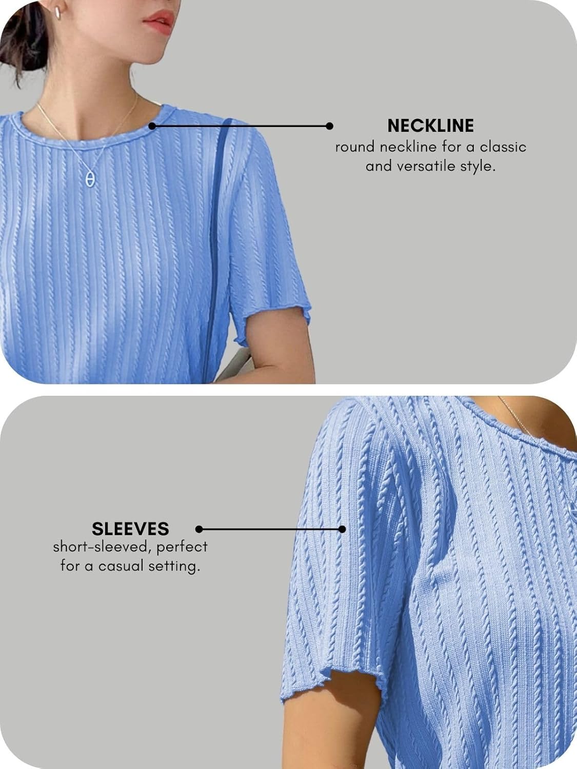 Each t-shirt highlights a delicate cable knit pattern that adds texture and sophistication to a classic silhouette. The short sleeves ensure breathability, making it suitable for all-day wear across seasons. Available in a stunning palette of pink, blue, black, and green, you can easily mix and match these tops with jeans, shorts, or skirts to create versatile looks that speak to your unique style.