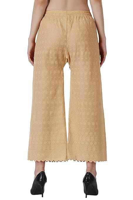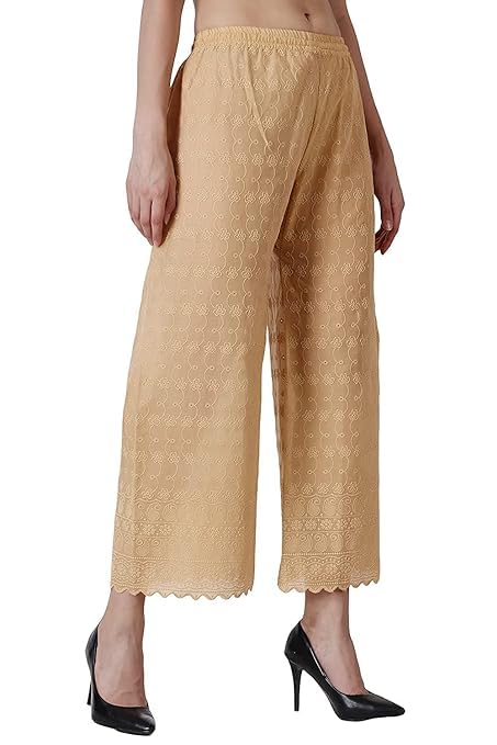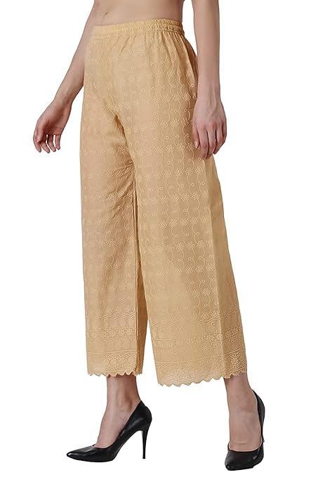 Play up girly elements correctly as you wear these chikankari palazzo. It is Stitched to perfection and will give you a smart look when teamed with a any tunic or long kurti. Club these with peep toes for a stunning look. Made from Cotton & intricate chikankari embroidery, these palazzo will accentuate your look effortlessly.