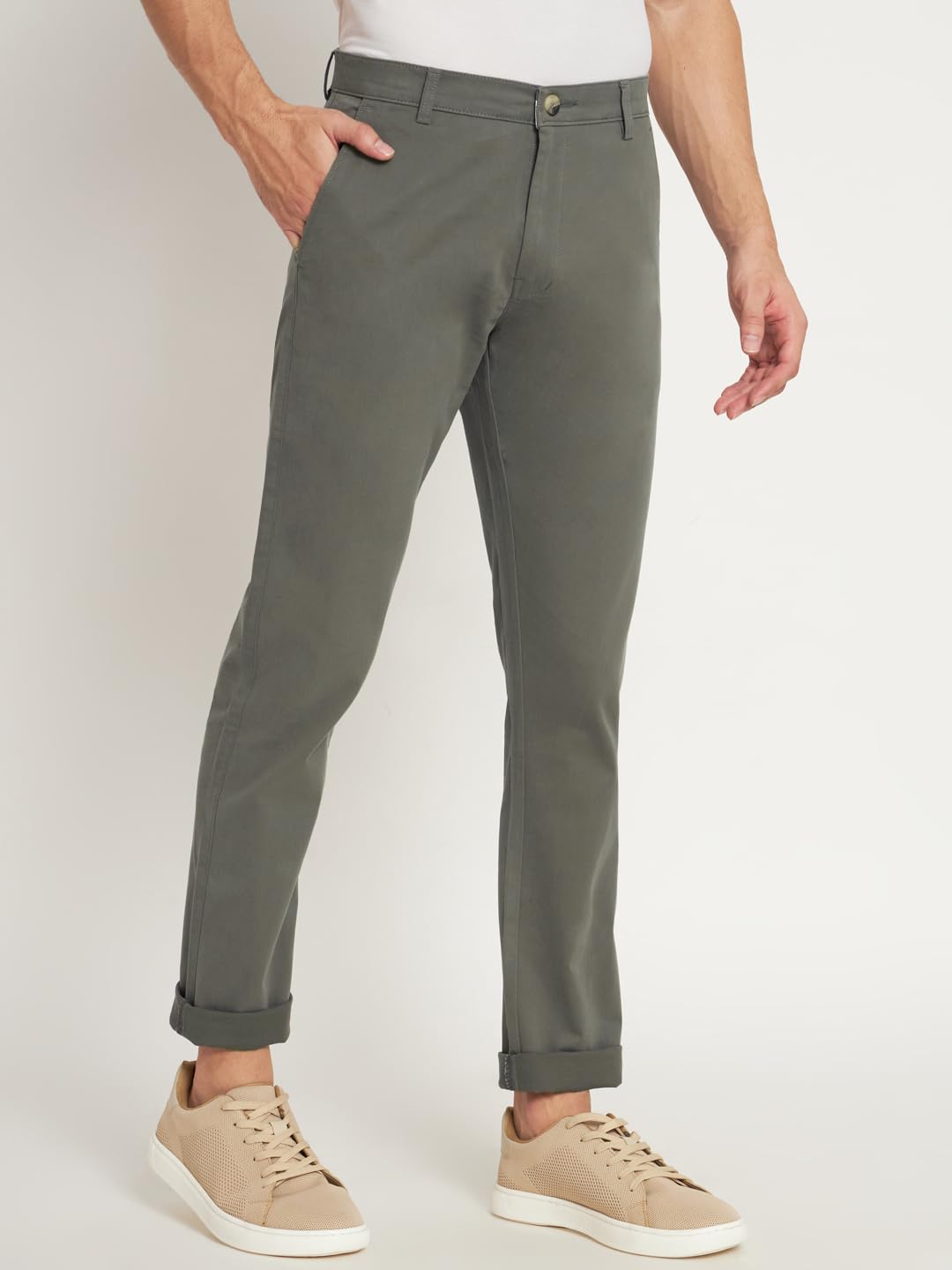 Cotton stretch fabric for ease of movementPair with solid polos or casual shirts and sneakers for a stylish casual look.Style: Casual Trousers ;Pattern: SolidZip fly with button closureSolid pattern
