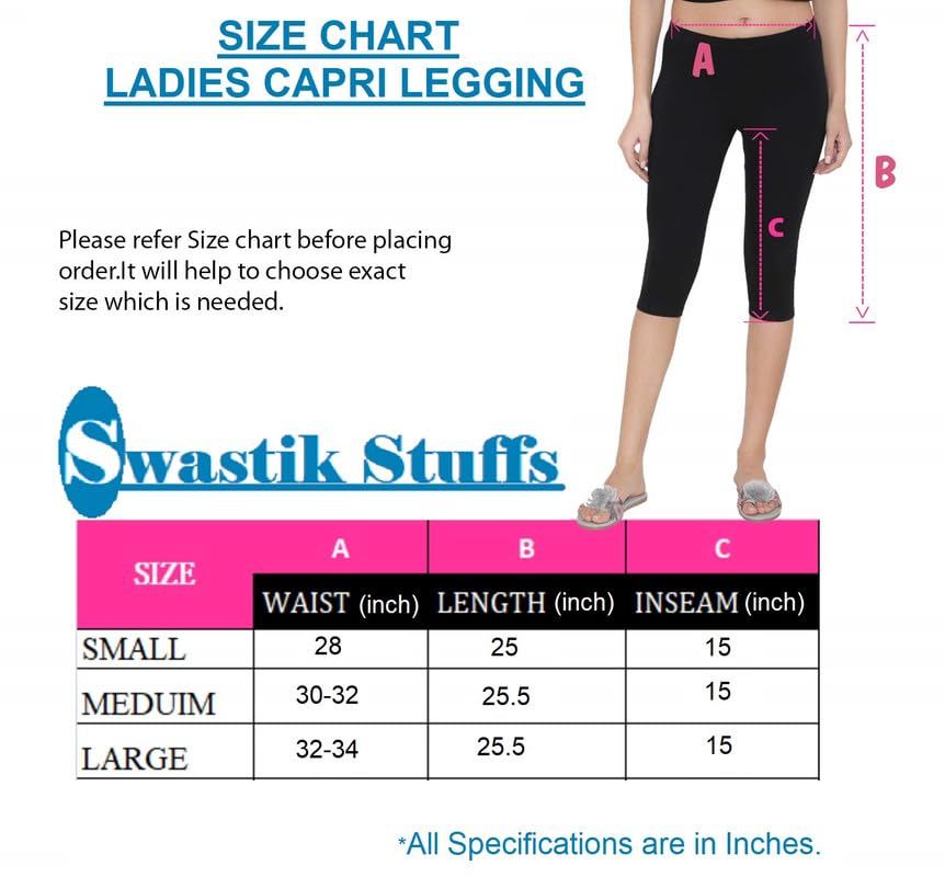 Swastik Stuffs 3/4th Leggings push up effect. High quality "Not See Through" fabric. Feels like a second skin with a smooth and cool feeling against your legs. Follow your dreams about sexy look. If not now then when? Don't waste time and get those absolutely gorgeous Capris Leggings. If you are a person who value comfort combined with sexiness those Capris are just for you. Gives you a wonderful feeling, just enjoy Yourself!! Perfect for active women, Yoga, Fitness, Gym, Walking, Exercise, Workout, Jogging, etc.