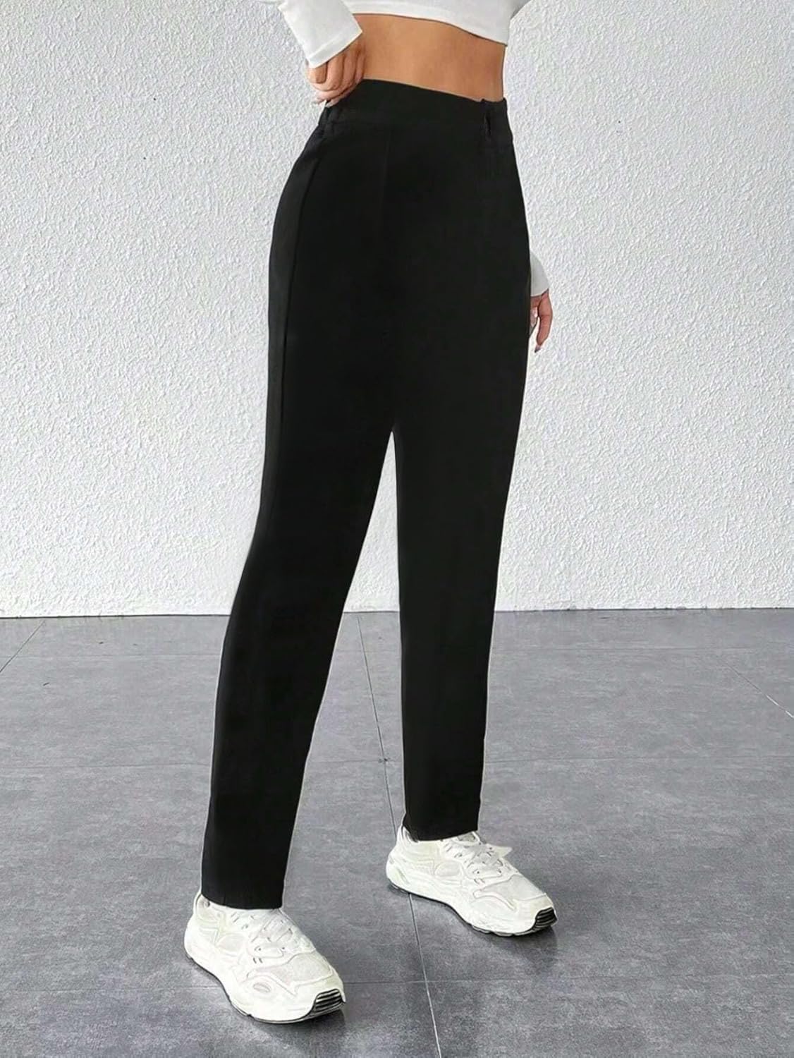 Perfectly suited for women who value versatility, these trousers transition seamlessly from casual to chic. Pair them with a tucked-in blouse for a professional vibe or a cropped top for a relaxed, trendy look. Their black hue adds a timeless, easy-to-match element to your wardrobe, making outfit planning a breeze.