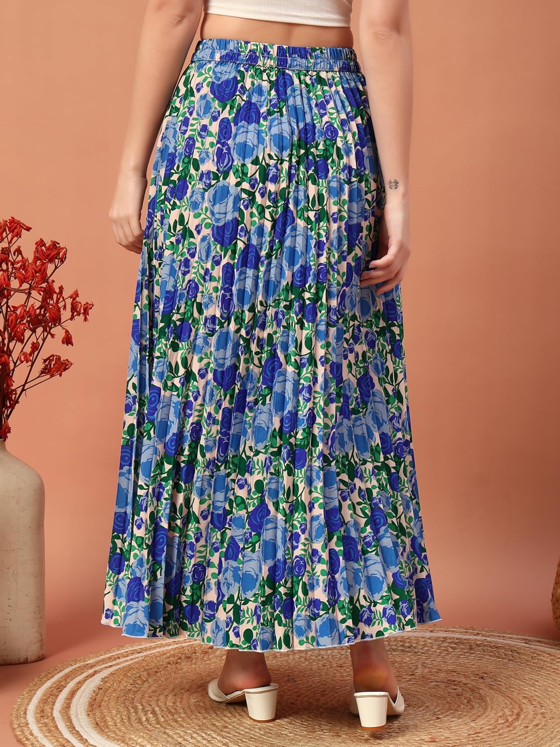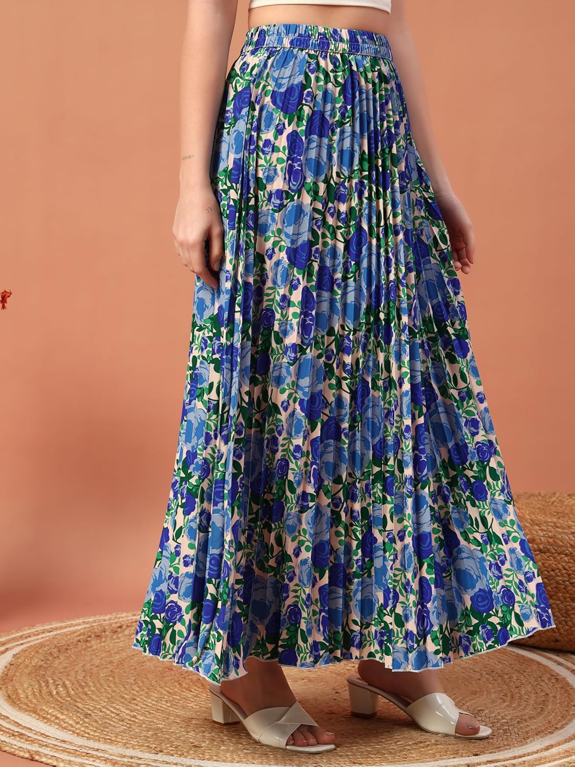 One of the standout features of this skirt is its accordion pleats. These carefully crafted pleats create a dynamic texture and movement, allowing the skirt to drape beautifully with every step. The graceful flow adds an element of drama and femininity, ensuring you feel captivating and poised all day long. Measuring just the right length, this skirt balances modesty and allure, making it perfect for numerous occasions — from formal dinners to casual brunches.